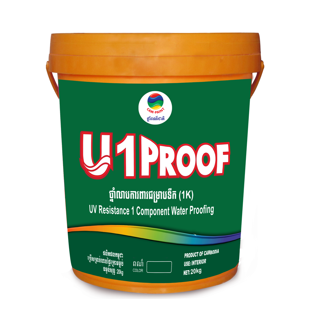 - ព័ត៌មានទូទៅពីផលិតផលៈ យូវ័នព្រូហ្វ (U1PROOF)ជាប្រភេទថ្នាំលាបការពារជ្រាបទឹក (1K) ដែលមានលក្ខណៈជាល្បាយលាយស្រាប់ ផលិតឡើងតាមរូបមន្តយ៉ាងពិសេស សម្រាប់លាបលើផ្ទៃខាងលើ ដើម្បីការពារការជ្រាបទឹកចុះទៅក្រោម